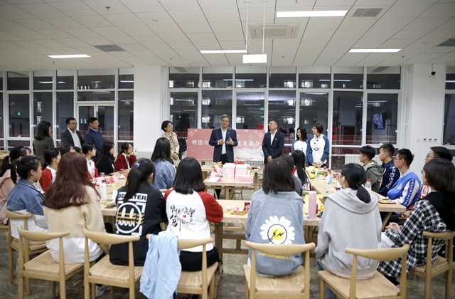 在生活组团食堂,明德、经管、知艺书院的同学们正在进行新生班级“见面会”。按照明德书院“八字八辈”的“字辈文化”,2020级是“惟”字辈,明德2004班学生正在为班级起班名,同学们激烈讨论,集思广益;与此同时,明德2008班将报到日10月9日定为班级的集体生日,正在共享生日蛋糕、共同庆祝。校长来到学生中间,坐下来与学生一同参加活动,对同学们积极建立班级文化表示了充分的肯定,校长讲到:世界一流大学建设,不仅要讲究科学技术,更要发挥人文关怀,提倡真善美;勉励在场学生要好好学习、把自己培养成材,要为学校人文社科建设做贡献,要将科学精神和人文情怀相结合,成长为“胸怀壮志,明德精工,创新包容,时代担当”的北理人。