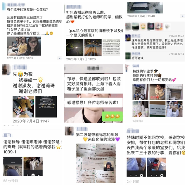 值得一提的是,学院退休教师、67岁的何平老师主动请缨,参与到本次专项工作中来,为6位本科生打包、邮寄行李;化学工程系的蔡玮玮老师,6月份刚做手术、身体未愈,也积极参与到本次专项工作中来,细心、耐心、专心,为3位学生打包、邮寄行李。带过14年毕业生的吴芹老师说,“这是我第一次以这种方式送别我的学生,感觉还挺亲切,我也算尽到最后的责任。”