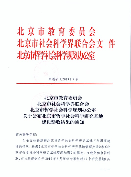 近日,北京市教育委员会、北京市社会科学界联合会、北京市哲学社会科学规划办公室联合发文,对2019年参与北京市哲学社会科学研究基地三年周期建设检查的结果予以公布。beat365北京经济社会可持续发展研究基地获评“优秀研究基地”。此次三年周期建设验收,全市共有17家研究基地参加,仅有4家获评市级优秀研究基地,另有2家研究基地检查结果为不合格。