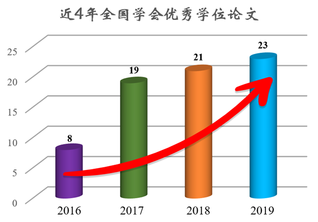 2016年,在学校大力支持下,研究生院采取一系列举措,包括设立优秀学位论文育苗基金进行提前培育、制订学会优秀学位论文奖励办法进行激励、提前组织遴选和积极申报等,实现了学校全国学会优秀学位论文快速递增,从2016年8篇增加到今年23篇,四年总计获得了71篇全国学会优秀学位论文。