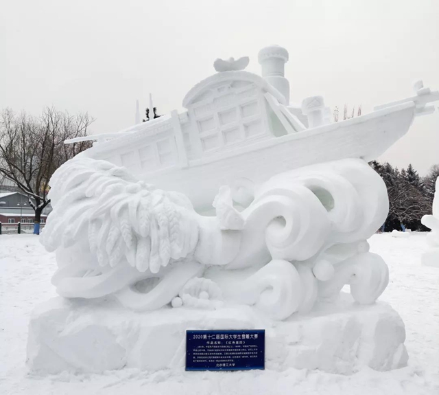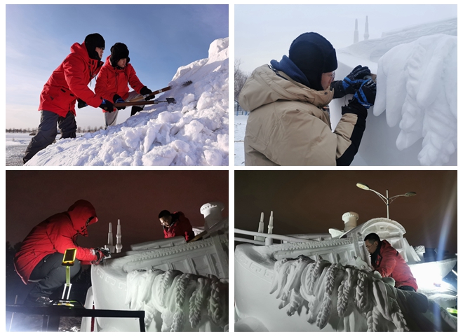 2020年1月4日,雪雕队前往哈尔滨开启比赛。三天的比赛时间里,雪雕队冒着零下20摄氏度的低温,在临时党支部带领下,经受住了恶劣自然条件和长时间大强度的户外作业的考验,齐心协力、拼搏奋斗,把红船精神注入作品,让冰雪焕发出火热的生命力。