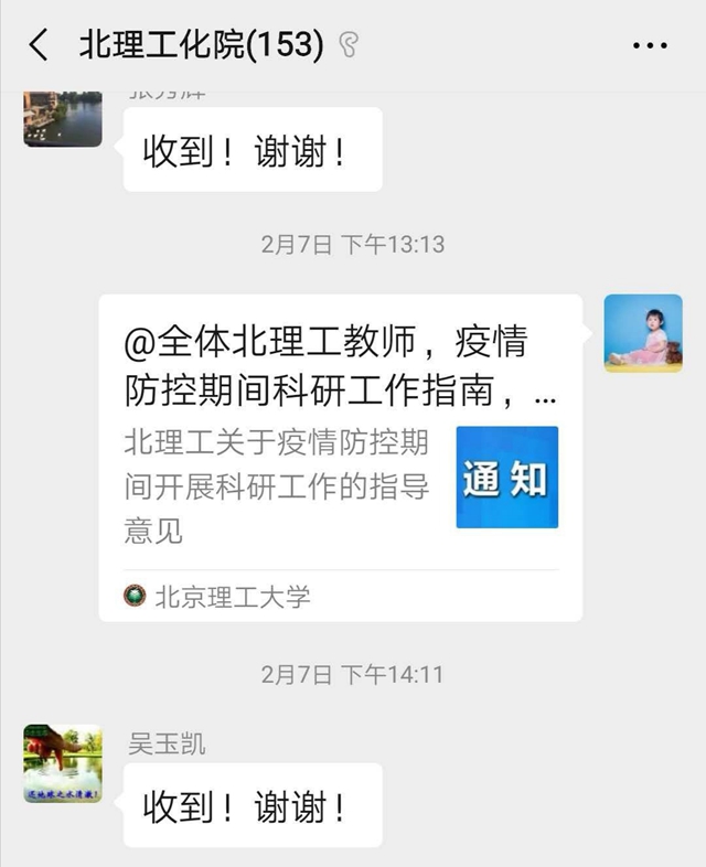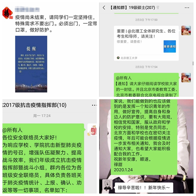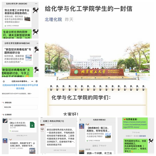 疫情防控期间,北理工化学与化工学院按照学校党委关于做好新型冠状病毒感染的肺炎疫情防控工作的相关要求,第一时间成立了以学院党委书记、院长为组长的疫情防控工作领导小组,全面落实党中央及各级部门决策部署,完善本学院防控举措。小组成员分工负责,强化责任担当,及时在防控工作群传达学校最新疫情防控要求,并按照学校要求在做好疫情防控工作的同时,扎实有效地推进了学院科研、教学、学生管理等各项工作。