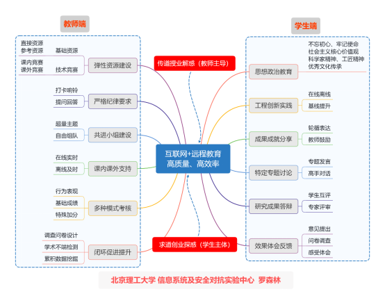 北京市教学名师、国家级特色专业(信息对抗技术)的“掌门人”罗森林教授有着丰富的教学经验,构建了一套“三站两线一群”的教学范式,整合优势,打出一套在线教学的“组合拳”。罗森林在本学期主讲“信息系统安全与对抗技术”研究型课程,该课程面向2017级本科生,有31名学生。在教学中,他运用学校“乐学”平台为提供丰富的教学资源,使用自己在“中国大学MOOC”开设的慕课开展教学,同时在工信部信息系统及安全对抗实验中心网站发布了“课程教学能力促进系统”,为学生提供实践操作的线上平台;“在线+离线”的学习任务发布;建设课程微信群,在发布学习要求通知的同时,为学生提供实时动态交流,满足每一名学生个性化的学习需要。罗森林把自己这套教学方式概括为“互联网+远程教育”系统解决方案,在实际教学中确保了在线教学高质高效。